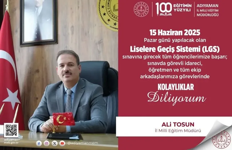 “15 Haziran 2025 Pazar günü yapılacak olan Liselere Geçiş Sistemi (LGS) sınavına girecek tüm öğrencilerimize başarı; sınavda görevli idareci, öğretmen ve tüm ekip arkadaşlarımıza görevlerinde kolaylıklar diliyorum.”
