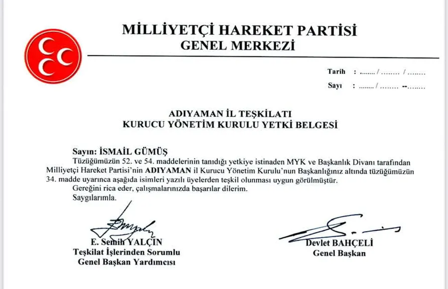 Milliyetçi Hareket Partisi (MHP) Adıyaman İl Başkanlığı görevinde yetki belgesini teslim alan İsmail Gümüş, yazılı bir açıklama yayımlayarak sürece ilişkin duygu ve düşüncelerini paylaştı. Gümüş, görevlendirmenin Devlet Bahçeli’nin emir ve talimatları doğrultusunda gerçekleştiğini belirterek, MHP Adıyaman teşkilatının çalışmalarına yön verecek yönetim kurulu üyelerine başarı dileklerinde bulundu.