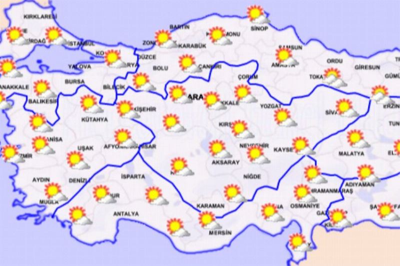 Ülkemizin kuzey, iç ve batı kesimlerinin parçalı yer yer çok bulutlu, Ege (Afyonkarahisar ve Kütahya hariç), Batı Akdeniz’in iç kesimleri, Batı Karadeniz(Sinop hariç), Orta ve Doğu Karadeniz’in iç kesimleri ile Kırklareli, Ankara, Çankırı ve Kırıkkale çevrelerinin yerel sağanak ve gök gürültülü sağanak yağışlı, diğer yerlerin az bulutlu ve açık geçeceği tahmin ediliyor.