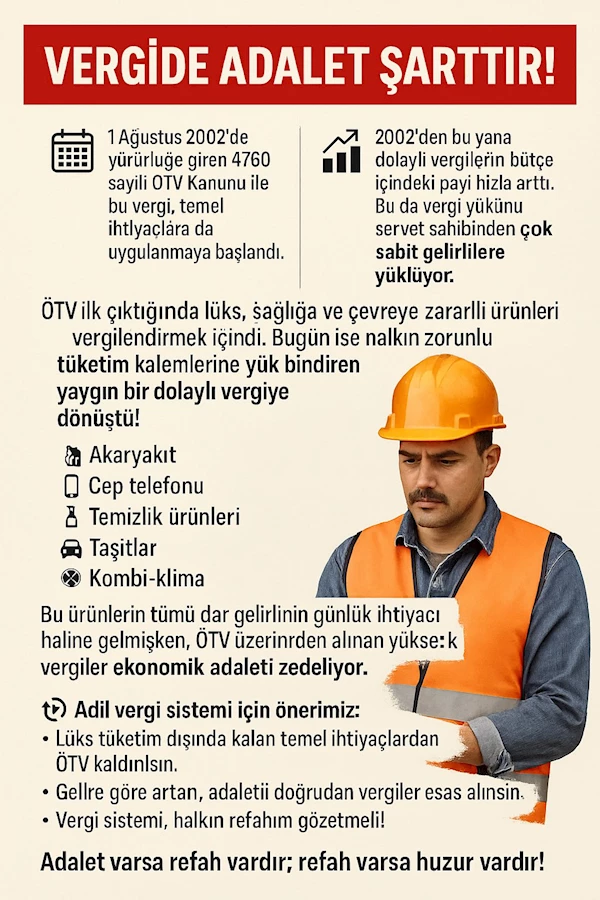 ÖTV uygulanan bazı kalemlerin halkın günlük yaşamında vazgeçilmez hale geldiğini belirten Yetiş, “Akaryakıt, cep telefonu, temizlik ürünleri, taşıtlar, kombi ve klima gibi ürünler dar gelirli vatandaş için artık lüks değil, ihtiyaçtır. Bu ürünlerden alınan yüksek dolaylı vergiler, halkın alım gücünü düşürüyor” dedi.