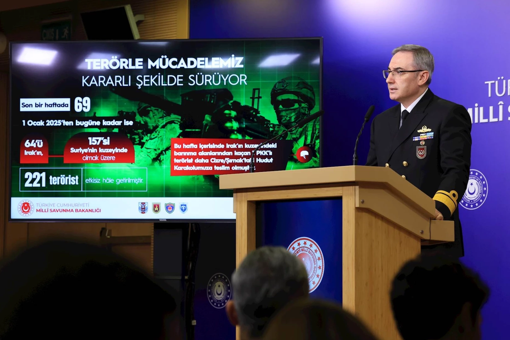 Basın ve Halkla İlişkiler Müşaviri ve Bakanlık Sözcüsü Tuğamiral Zeki Aktürk tarafından icra edilen toplantıda, PKK/PYD/YPG/SDG ve DEAŞ terör örgütleri başta olmak üzere her türlü tehdit ve tehlikeye karşı kesintisiz bir şekilde operasyonların başarıyla icra edildiğine dikkati çekilirken, son bir haftada 69, 1 Ocak'tan bugüne kadar ise 64’ü Irak’ın, 157’si Suriye’nin kuzeyinde olmak üzere 221 terörist etkisiz hâle getirildiği açıklandı.