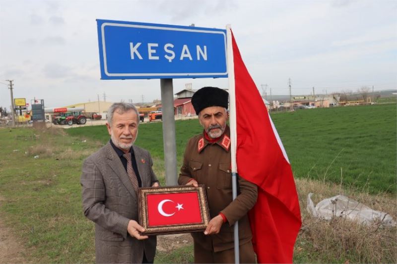 Çanakkale Zaferi'nin 108. yılı için şehitler anısına, elinde Türk bayrağı ile 7 gün önce İstanbul'un Bağcılar ilçesinden yürümeye başlayan Saffet Gümüş, Keşan’a ulaştı. Saffet Gümüş, 'Torundan Dedeye Vefa Yürüyüşü'nün bu yıl 5.’sini gerçekleştirdiğini söyledi. Gümüş’ü, Keşan’ın girişinde Belediye Başkan Yardımcısı Nuran Uslu karşıladı. Gümüş, Uslu’ya Türk bayrağı motifli tablo hediye etti. Uslu, Saffet Gümüş’ün, Bağcılar’dan 4 Mart 2023 tarihinde yola çıktığını belirterek, “Bugünde Keşan’da misafirimiz. Kendisini karşılayarak, ‘hoş geldin’ dedik. Bu çıkmış olduğu yolculuğun hayırlı olmasını diliyorum. İnşallah selametle Çanakkale’ye ulaşır” dedi.
