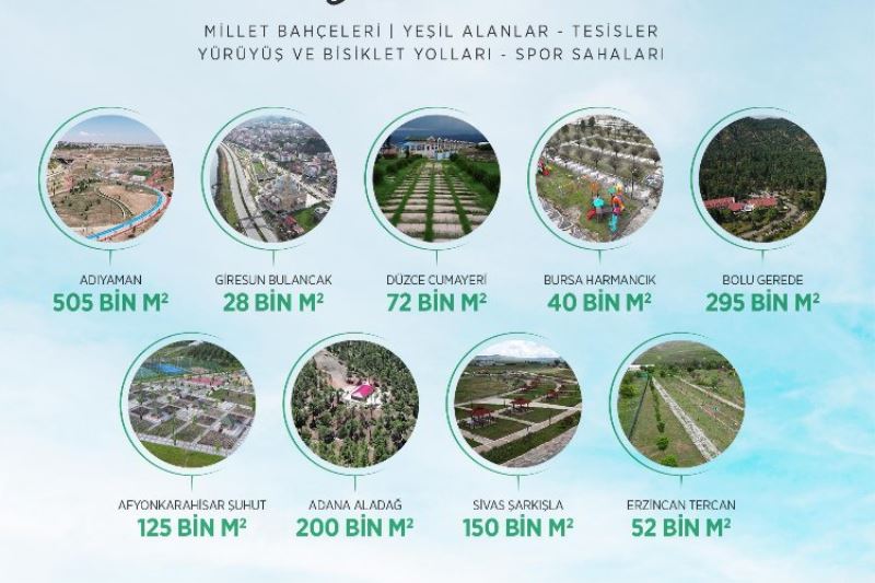 Cumhurbaşkanı Erdoğan, hizmete sunulan Adıyaman Millet Bahçesi'nin 505 bin metrekare, Giresun Bulancak Millet Bahçesi'nin 28 bin metrekare, Düzce Cumayeri Millet Bahçesi'nin 72 bin metrekare, Bursa Harmancık Millet Bahçesi'nin 40 bin metrekare, Bolu Gerede Millet Bahçesi'nin 295 bin metrekare, Afyonkarahisar Şuhut Millet Bahçesi'nin 125 bin metrekare, Adana Aladağ Millet Bahçesi'nin 200 bin metrekare, Sivas Şarkışla Millet Bahçesi'nin 150 bin metrekare, Erzincan Tercan ilçesi Camii Şerif Millet Bahçesi'nin 52 bin metrekare olmak üzere toplam 1 milyon 466 bin metrekare büyüklüğe sahip olduğunu belirtti.