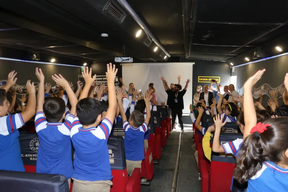 Gezen Sinema etkinliğine katılan Adıyaman İl Milli Eğitim Müdürü Ali Tosun ve Adıyaman Kültür ve Turizm İl Müdürü Abuzer Gelse öğrencilerin sevinçlerine ortak oldular.