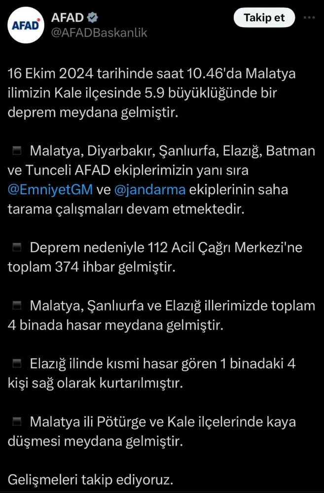 AFAD tarafından yapılan resmi açıklamaya göre, Malatya’nın Kale ilçesinde meydana gelen deprem sonrasında Malatya, Diyarbakır, Şanlıurfa, Elazığ, Batman ve Tunceli illerinde hissedildi. Deprem sonrası AFAD ekiplerinin yanı sıra Emniyet Genel Müdürlüğü ve jandarma ekiplerinin saha tarama çalışmaları başlatıldı. Ancak AFAD açıklamasında depremin yoğun hissedildiği Adıyaman’ın adı geçmedi.