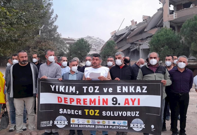 Aydın açıklamasında ayrıca, “6 Şubat’ta yaşanan depremlerden dolayı birçok sorunumuz var ancak bugün yapılan şikâyet ve uyarılara rağmen ilimizde kural tanımaz, kanun işlemez bir şekilde ve en önemlisi de halk sağlığını ciddi şekilde tehdit ederek yapılan yıkım, ayrıştırma, taşıma ve döküm sahalarından yayılan toz konusunu konuşacağız. Başından sonuna kadar tam bir kanunsuzluk ve suç zinciri şeklinde yapılan bu işlemler konusunda kamu otoritesinin üç maymunu oynaması ve duyarsız kalması halkı canından bezdirmiştir. Depremden sağ kurtulduğumuza sevinirken tozdan kanser olma korkusu kabusu sardı etrafımızı. Kenti terk etmediğimiz için cezalandırılıyor muyuz, yoksa göçe mi zorlanıyoruz bilemiyoruz. Depremden sonra böylesi bir yıkım ve yıkımın sonucunda oluşan toz ikincil, üçüncül travmalara neden olmaktadır. Sağlık müdürlüğü ve Sosyal güvenlik kurumu müdürlüğü ya da bakanlıkları derhal göreve çağrılmalı bu sağlıksız ve hastalıklı duruma müdahale etmelidir. Toza maruziyet bir işçi sağlığı sorunudur, halk sağlığı sorunudur ve bugün yaşadıklarımıza dönüp baktığımızda toza maruziyetin politik olduğunu da görüyoruz. Çünkü bizim toza maruz bırakılmamız zorunluluktan değil tercihtendir. Kamu otoritesinin halkın sağlığı yerine sermayeyi tercih ettiğini görüyoruz. Sermaye yorulmasın, sermaye para kaybetmesin, sermayenin karı artsın diye biz tozla baş başa bırakılıyoruz. TTB ve Temiz Hakkı Platformu Ekim ayında yayınladığı raporda Adıyaman’da 2 noktada asbest tespit ettiğini raporladı, Adıyaman yetkilileri rapora dair bir cümle kurmadılar ya da biz görmedik.