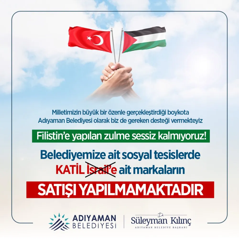 Adıyaman Belediye Başkanı Dr. Süleyman Kılınç'ın talimatıyla, Adıyaman'ın çeşitli bölgelerinde hizmet veren sosyal tesislerde İsrail menşeli ürünlerin satışı durduruldu. Başkan Kılınç, İsrail'in Filistin'deki Siyonist işgal ve saldırılara karşı Filistin direnişini desteklediklerini belirterek İsrail'in Gazze'deki saldırılarını sert bir şekilde kınadıklarını ifade etti.