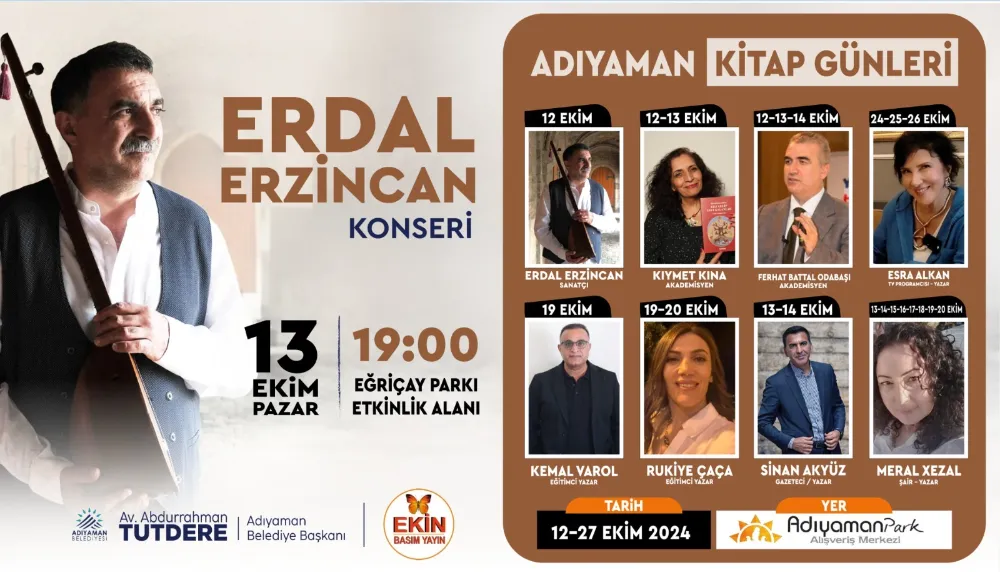 Kitap Günleri’nin açılışı, 13 Ekim’de saat 19.00’da Eğriçay Parkı’nda düzenlenecek olan Erdal Erzincan konseriyle başlayacak. Anadolu halk müziğinin güçlü sesi ve bağlama üstadı olan Erzincan, açılış gecesinde sevenlerine unutulmaz bir performans sunacak. Konserle birlikte başlayan etkinlikler iki hafta boyunca dolu dolu devam edecek.