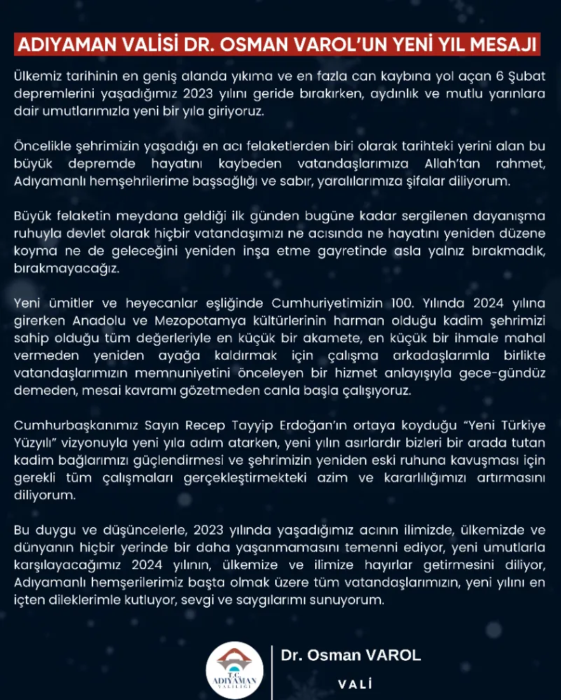 Bu duygu ve düşüncelerle, 2023 yılında yaşadığımız acının ilimizde, ülkemizde ve dünyanın hiçbir yerinde bir daha yaşanmamasını temenni ediyor, yeni umutlarla karşılayacağımız 2024 yılının, ülkemize ve ilimize hayırlar getirmesini diliyor, Adıyamanlı hemşerilerimiz başta olmak üzere tüm vatandaşlarımızın, yeni yılını en içten dileklerimle kutluyor, sevgi ve saygılarımı sunuyorum.