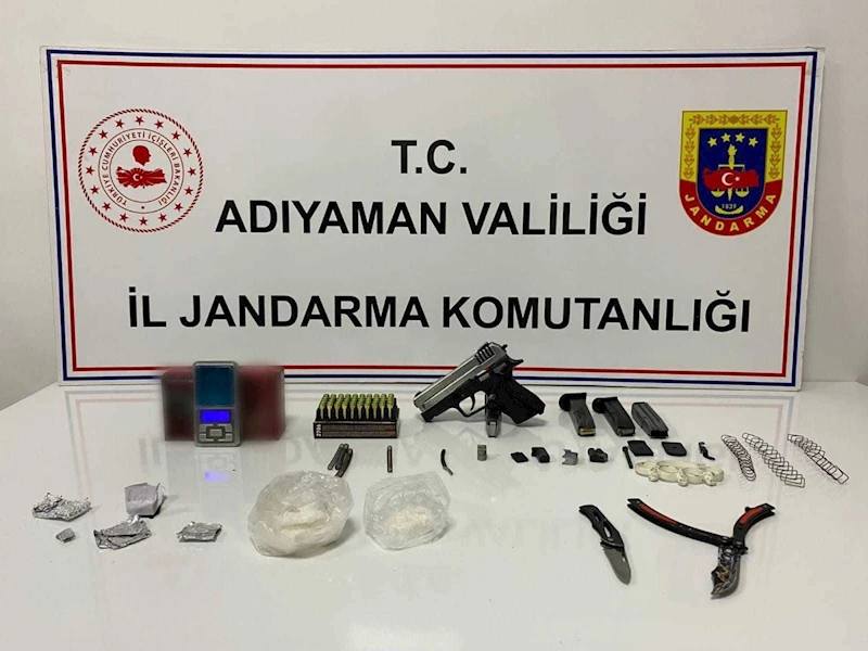 Adıyaman İl Jandarma Komutanlığı unsurlarınca halkın huzur ve güvenliği için aralıksız devam eden çalışmalar devam ediyor. 04 Aralık 2023 tarihinde yapılan Jandarma istihbari çalışmalarda, N.P. isimli şüpheli şahsın aracında durduruldu. Araçta yapılan arama sonucu 56,68 gram metamfetamin ele geçirildi. Suç ile ilgili yapılan araştırmalar sonucunda şüpheli şahsın ikametinde de arama yapıldı. Şüpheli şahsın ikametinde yapılan aramada, 1 adet kurusıkı tabanca ve 51 adet kurusıkı tabanca mermisi, 1 adet hassas terazi ile 1 adet muşta ve muhtelif tabanca parçaları ele geçirildi. Şüpheli şahıs adli makamlara sevk edilirken, konuya ilişkin soruşturma devam ediyor.
