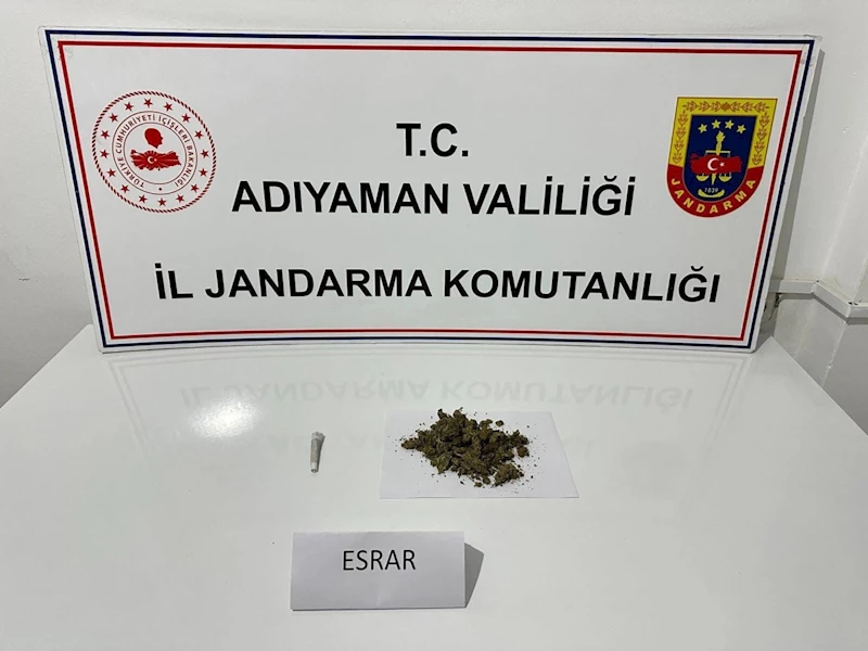 Adıyaman İl Jandarma Komutanlığı ekipleri tarafından yapılan çalışmada şüphe üzerine durdurulan S.O., üzerinde arama yapıldı. Yapılan aramada 80 gram esrar maddesi ele geçirilirken Kullanmaya hazır halde 1 adet uyuşturucu madde kullanma aparatı ele geçirildi. Ele geçirilen uyuşturucu muhafaza altına alınırken, S.O., gözaltına alındı. Gözaltına alınan şüpheli sorgulanmak üzere jandarmaya götürüldü.