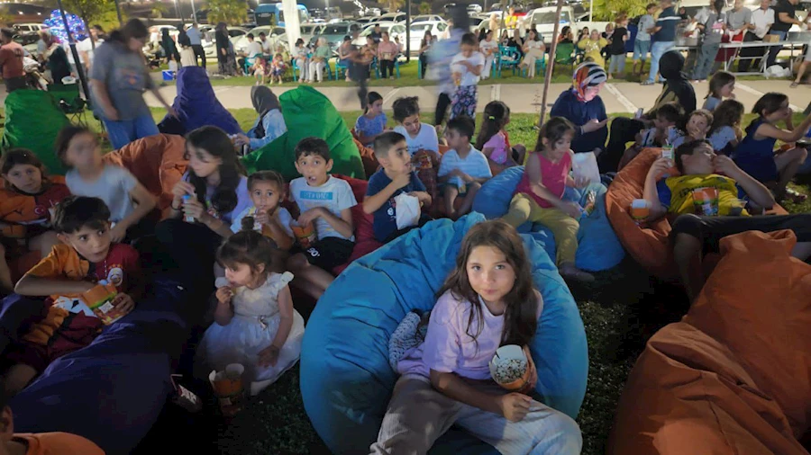 Yaz sıcağının bunaltıcı havası içerisinde açık havada çocuk animasyon filmi izleyen çocukların sevinçleri gözlerine yansıdı.