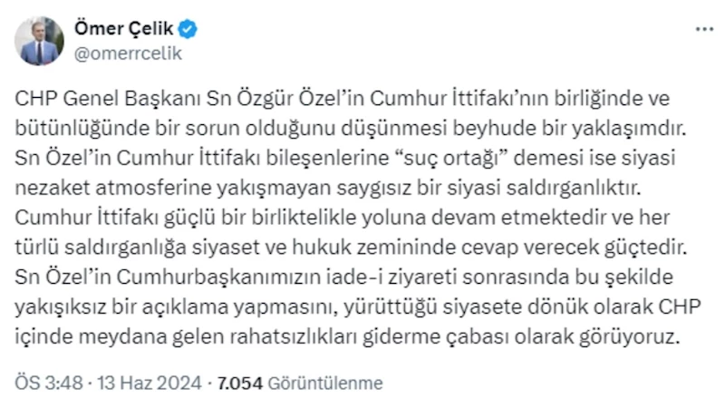 Ömer Çelik, sosyal medya hesabından yaptığı açıklamada, “Sayın Özel'in Cumhur İttifakı bileşenlerine 'suç ortağı' demesi, siyasi nezaket atmosferine yakışmayan saygısız bir siyasi saldırganlıktır” ifadelerini kullandı. Çelik, Cumhur İttifakı'nın güçlü bir birliktelikle yoluna devam ettiğini ve her türlü saldırganlığa karşı siyaset ve hukuk zemininde cevap verecek güçte olduğunu vurguladı.