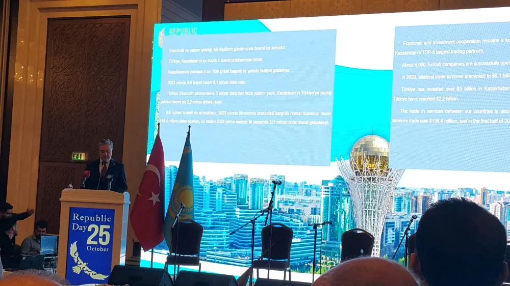 Resepsiyonda konuşma yapan Kazakistan Ankara Büyükelçisi Yerkebulan Sapiyev, Kazakistan ile Türkiye arasındaki köklü ilişkilere değindi. Sapiyev, “1991 yılında kardeş Türkiye Cumhuriyeti, Kazakistan'ın bağımsızlığını dünyada tanıyan ilk ülke oldu. Bu adım, tarihi, dili, kültürü aynı halklarımızın kardeşliğini gösterdi ve karşılıklı yararlı işbirliğinin geliştirilmesi için büyük imkanlar yarattı,” ifadelerini kullandı. Büyükelçi, ayrıca iki ülke arasındaki ekonomik işbirliğine dikkat çekerek, Türkiye'nin Kazakistan’ın en büyük beş ticaret ortağından biri olduğunu ve ülkede yaklaşık 4 bin Türk şirketinin başarılı bir şekilde faaliyet gösterdiğini belirtti. 2023 yılında ikili ticaret hacminin 6.1 milyar dolara ulaştığını ve Türkiye'nin Kazakistan ekonomisine 5 milyar dolardan fazla yatırım yaptığını ifade etti. Kazakistan'ın Türkiye'ye yaptığı yatırım hacmi ise 2.2 milyar dolar olarak gerçekleşmişti.