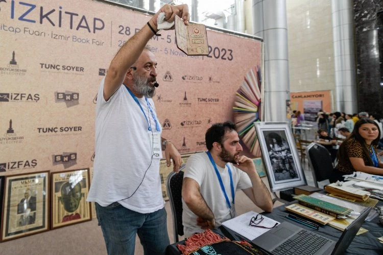 İZMİR (İGFA) - İzmir Büyükşehir Belediyesi ev sahipliğinde İZFAŞ ve SNS Fuarcılık tarafından Fuar İzmir’de düzenlenen İZKİTAP – İzmir Kitap Fuarı; imza etkinlikleri ve söyleşilerin yanı sıra müzayedelere de ev sahipliği yaptı. 100. Yıl Özel Müzayedesi, Hermes Sahaf Kurucusu Ümit Nar yönetiminde gerçekleştirildi. Müzayedede aralarında, Mustafa Kemal Atatürk’ün ıslak imzasını taşıyan Mebus Defteri, Nazım Hikmet’in Bursa Cezaevi’nde eşi Piraye için yaptığı “Nazım, Bursa, Zevcem Pirayem” yazılı ahşap kalemlik, 1954 yılına ait “İzmir'de Alınteri, Boyozcu, Kordon 1954” ıslak imzalı Ara Güler kaşeli fotoğraf, İzmir’in işgali sırasında ilk kurşunu sıkarak direnişi başlatan Gazeteci Hasan Tahsin’in de yer aldığı gazeteci, yazar, milletvekili Ahmed Rasim’e ithaflı ıslak imzalı fotoğraf, Cemal Süreya, Behçet Necatigil, Uğur Mumcu gibi değerli yazarların imzalı kitaplarının da olduğu birçok özel parça yer aldı.