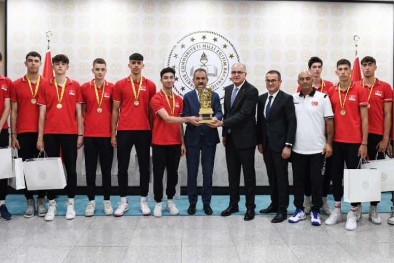 ANKARA (İGFA) - MEB Tevfik İleri Salonu'nda gerçekleşen kabulde Brezilya'da düzenlenen organizasyonda oynadığı 6 karşılaşmada tüm rakiplerini yenerek dünya şampiyonluğuna ulaşan TVF Spor Lisesi Erkek Voleybol Takımı oyuncuları makamında kabul eden Milli Eğitim Bakanı Mahmut Özer, Türkiye'nin uluslararası yarışmalarda geçmişe kıyasla çok önemli başarılar elde ettiğini kaydetti.