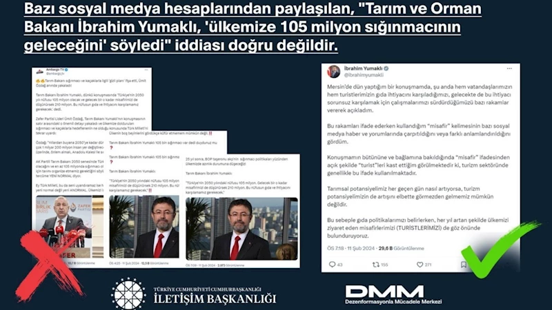 Dezenformasyonla Mücadele Merkezi’nden yapılan açıklamada, Tarım ve Orman Bakanı İbrahim Yumaklı’nın, 'ülkemize 105 milyon sığınmacının geleceğini' söyledi" iddiasına yalanlama geldi.