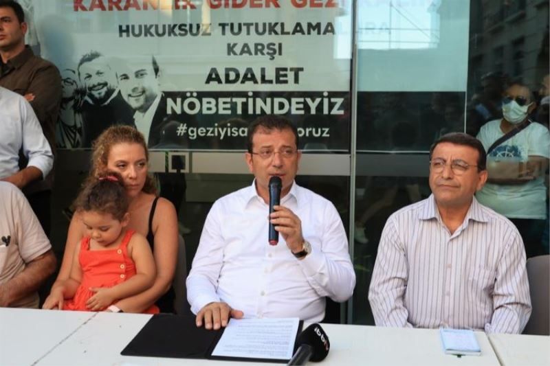Gezi davasında tutuklu bulunan Tayfun Kahraman’ın eşi Meriç Kahraman ve kızı Vera ile de bir araya gelen İmamoğlu; sendikalar, dernekler ve sivil toplum kuruluşlarının katılımıyla süren nöbette bir konuşma yaptı.