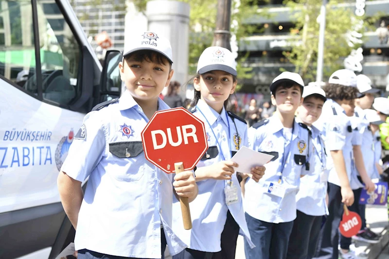 Ankara Büyükşehir Belediyesi Çocuk Meclisi 28. Dönem Meclis Üyeleri, 15 Temmuz Kızılay Milli İrade Meydanı’nda “Çocuk Polisler Trafiği Denetliyor” uygulamasına imza attı. Denetimler, Ankara Emniyet Müdürlüğü Trafik Denetleme Şube Müdürlüğü polis ekiplerinin eşliğinde gerçekleşti. Her yıl trafik kurallarına dikkat çekmek için gerçekleştirilen denetimde trafik polisleriyle buluşan çocuk polisler, görev paylaşımı sonrası gruplara ayrılarak trafik denetimine çıktı. Ankara Büyükşehir Belediyesi Çocuk Meclisi kararı ile hayata geçirilen trafik denetimleri, Ankara Emniyet Müdürlüğü Trafik Denetleme Şube Müdürlüğü iş birliği ile sürdürülürken, Çocuk Meclisi Üyesi Başkentli çocuklar, Kızılay Güvenpark çevresindeki yaya ve araç trafiği denetimleri gerçekleştirdi. Üniforma ve şapkalarıyla Kızılay’da uygulamalı denetim yapan küçük polisler, “Trafik kültürü, kanunlarla değil saygıyla gelişir”, “Emniyet kemeri hayatla olan bağımızdır”, "Hırsız malımızı, hız canımızı alır” ve “Yaşama hakkımı lastiklerinle çiğneyemezsin” gibi sloganlarla vatandaşlara önemli mesajlar verdiler.