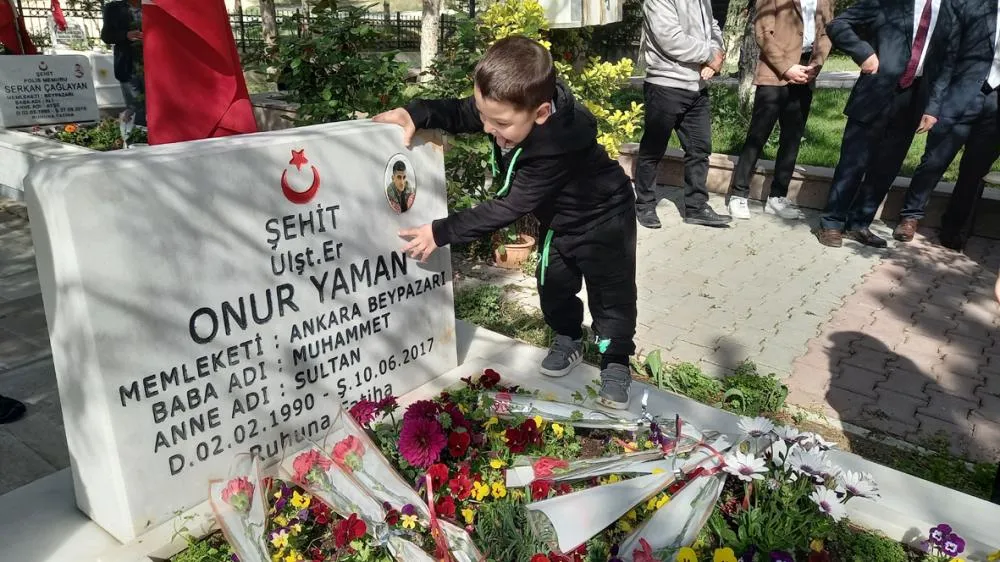Şehit Onur Yaman'ın kız kardeşinin çocuğu 3 yaşındaki ,dayısının mezar taşındaki fotoğrafı öpmesi aileyi hüzne boğdu.