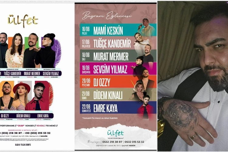 İSTANBUL (İGFA) - Bu yıl Kurban Bayramı'nda, ünlü sanatçılar Mami Keskin – (16/06 /2024 Pazar) , Tuğçe Kandemir – ( 17/06 /2024 Pazartesi)  , Murat Mermer –( 18/06 /2024 Salı ) ,Sevgim Yılmaz- ( 19/06 /2024 )  Carşamba , Dj Ozzy-( 20/06 /2024 )  Perşembe, Didem Kınalı- ( 21/06 /2024 Cuma) , Emre Kaya – ( 22/06 /2024 Cumartesi ) gibi isimler Olga &Tolga Events organizasyonu ile  sahne alacağı muhteşem konserler, Ülfet Restaurant misafirlerine unutulmaz anlar yaşatacak. Her bir sanatçının kendine özgü performansları ile dolu dolu bir müzik ziyafeti sizleri bekliyor.