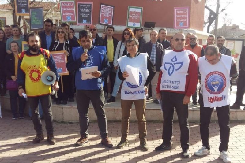 Bursa'nın Yenişehir ilçesinde Cumhuriyet Meydanı'nda 5 eğitim sendikası banka promosyonlarıyla ilgili bir basın açıklaması yaptı.