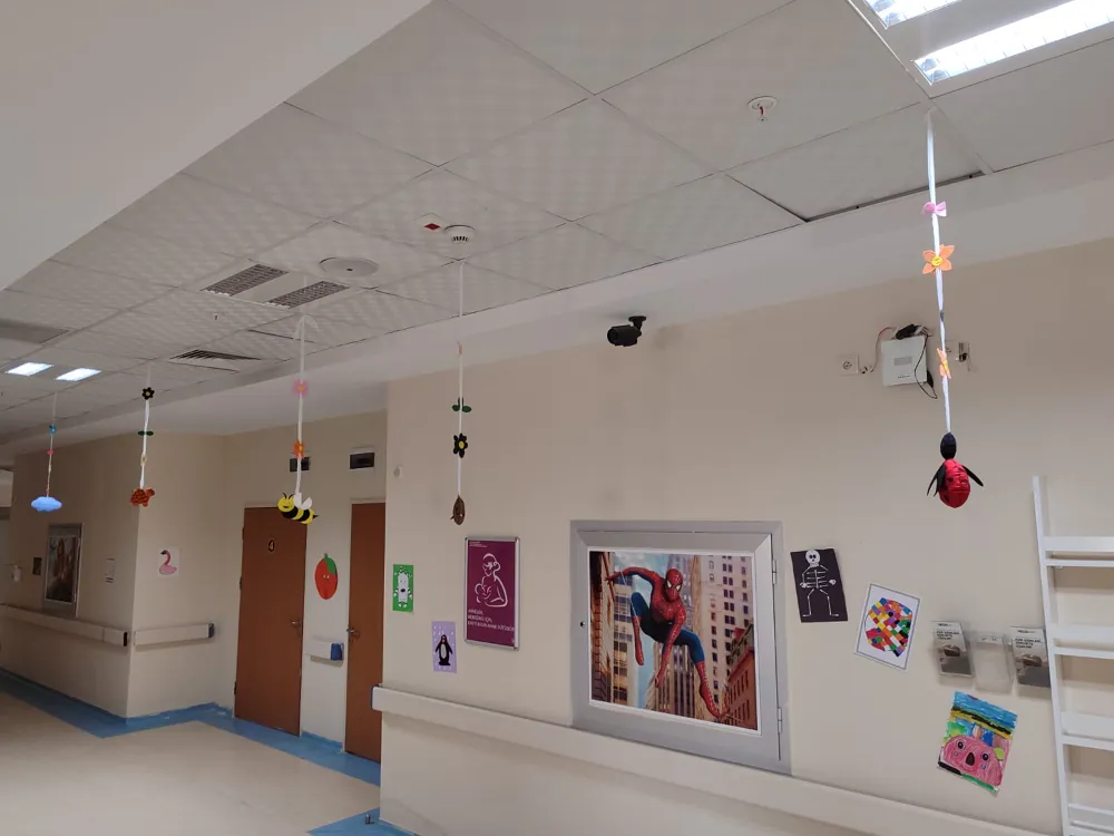 Hasta çocukları çocuk servisi duvarlarındaki ve tavanda ki çizgi film karakterleri karşılıyor.