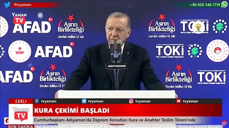 Cumhurbaşkanı ve AK Parti Genel Başkanı Recep Tayyip Erdoğan, Adıyaman’da deprem konutlarının kura ve anahtar teslim töreninde konuşuyor.
