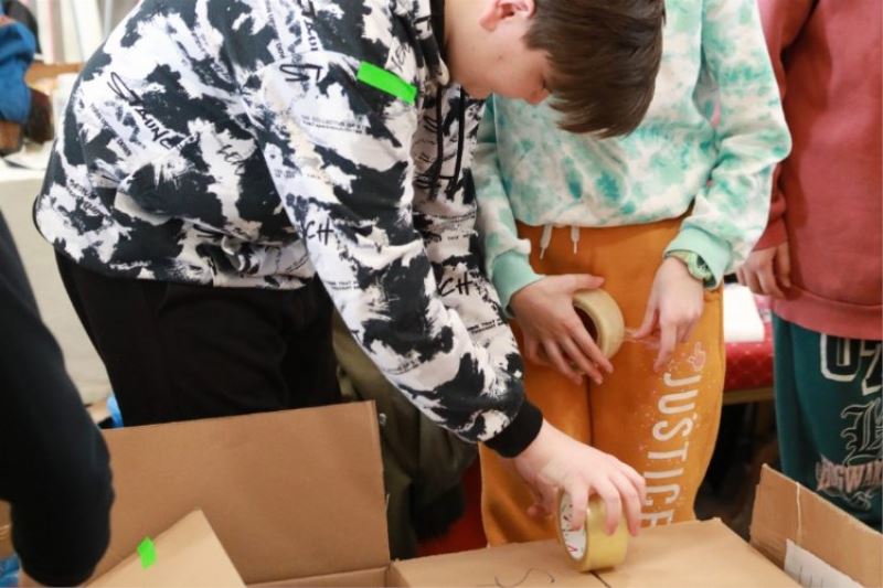 Amcalarıyla birlikte koli ve bantlama yapan iki kardeş, memleketlerinde kalanlara bu şekilde yardım ettiklerini dile getirdi. 12 yaşındaki İpek, “Kolonyaları bantlıyorum, kolilere yerleştiriyorum. Burada çalışmak beni mutlu ediyor” ifadelerini kullandı.