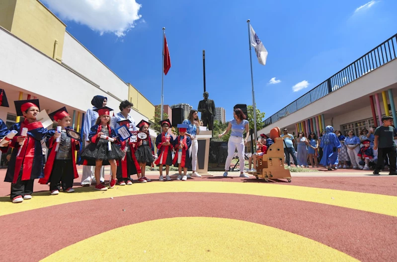Ankara Büyükşehir Belediyesi tarafından hizmete açılan Türkiye’nin en büyük Engelsiz Çocuk Gündüz Bakımevi’nde yılsonu etkinliği gerçekleştirildi.Özel gereksinimli ve normal gelişim gösteren çocukların bir arada eğitim aldığı merkezde 3-6 yaş aralığındaki 72 öğrenci, düzenlenen etkinlikte hünerlerini sergilerken 14 öğrenci ise mezun olarak ilkokula uğurlandı. Mezuniyet heyecanının yaşandığı Engelsiz Çocuk Gündüz Bakımevi’nde, çocukların öğretmenleri eşliğinde gerçekleştirdiği gösteriler renkli görüntülere sahne oldu. Eğitmen Cansu Murat’ın işaret diliyle okuduğu İstiklal Marşı ile başlayan etkinlikler, İngilizce olarak hazırlanan ”Pamuk Prenses ve Yedi Cüceler” tiyatrosu ve dans gösterileri ile devam etti. Öğrenci velilerinin ilgiyle izlediği mezuniyet töreni, 14 öğrencinin keplerini hava atmasıyla sona erdi. Sosyal Hizmetler Daire Başkanı Önder Yanmaz amaçlarının daha çok çocuğa kaliteli eğitim vermek olduğunu belirterek, “Türkiye’nin en akıllı ve en büyük Engelsiz Çocuk Gündüz Bakımevi’nde eğitim öğretim yılını tamamlamış bulunuyoruz. Çocuklarımız bir yıl boyunca almış oldukları eğitim sonrasında velilerimizin ve misafirlerimiz ilgiyle izlediği bir gösteri hazırladılar. Yeni eğitim öğretim yılında da Engelsiz Çocuk Gündüz Bakımevi’mizde çalışmalarımıza devam edeceğiz” derken, uzman eğitmen kadrosuyla standartların üstünde hizmet verdiklerinin altını çizen Engelsiz Çocuk Gündüz Bakımevi Müdürü Meryem Güçkıran yaptığı açıklamada: