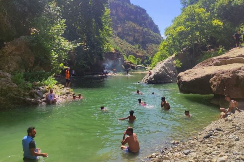 BATMAN (İGFA) - Sason-Kulp ilçeleri arasında bulunan Zore Çayı'na akın eden vatandaşlar burada bulunan şelaleden soğuk sular içerek Zore Çayı'nda yüzerek serinliyorlar.