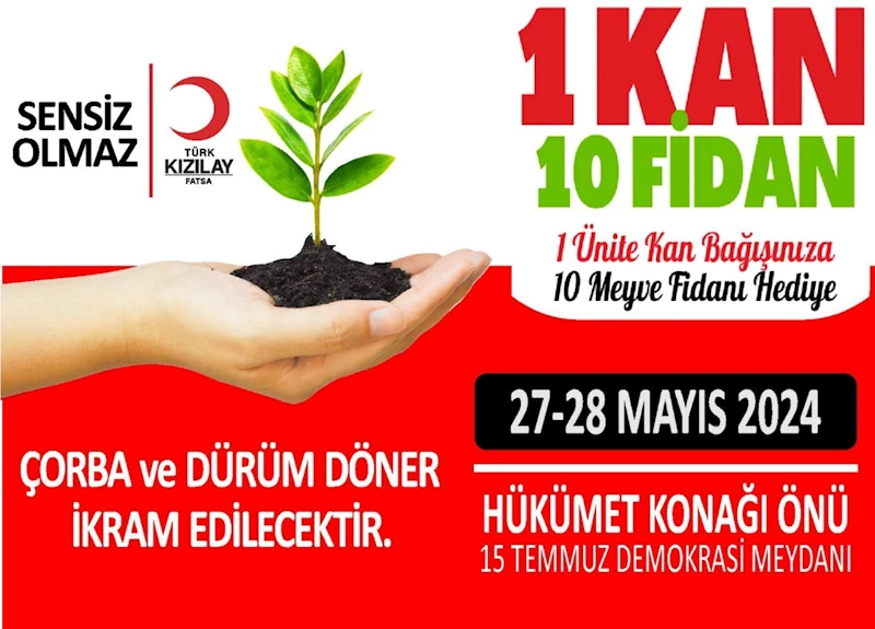 Türk Kızılay Derneği Fatsa Şube tarafından 27-28 Mayıs günleri düzenlenecek kan bağışı etkinliğinde kan bağışçılarına ünite başına 10'ar fidan'ın yanı sıra döner dürüm ve çorbanın da ikram edileceği açıklandı. Etkinliğe tüm duyarlı vatandaşları davet eden Türk Kızılay Derneği Fatsa Şube Başkanı Adil Keskin'in açıklaması’nda; "Değerli Kan Dostum; İlçe Milli Eğitim Müdürlüğümüzün desteği, ilçemizde faaliyet gösteren STK, siyasi parti, kurum ve kuruluşların katılımı ile 27-28 Mayıs 2024 tarihlerinde Fatsa Hükümet Konağı önünde kan alımı etkinliği planlanmaktadır. '1 Kan 10 Fidan' sloganı ile düzenleyecek olduğumuz etkinliğimizde, kan bağışında bulunan tüm vatandaşlarımıza 10 adet meyve fidanı hediye edilecek, kan verenlere ayrıca çorba ve dürüm döner ikramlarımız olacaktır. Bu kapsamda, çevrenizin bilgilendirilmesi ve kan verme duyarlılığı konusunda duyuruların yapılmasını bilhassa rica ediyorum. 27 Mayıs, Pazartesi günü, saat 11:00’de şehir protokolümüzün katılımı ile planlamış olduğumuz açılışımıza teşrifleriniz bizleri onurlandıracaktır." İfadelerine yer verdi.