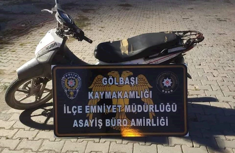 Gölbaşı İlçe Emniyet Müdürlüğü'ne bağlı Gölbaşı Asayiş Büro Amirliği ekipleri tarafından ilçede plakasız motosikleti fark edince durdurdu. Polis ekiplerince yapılan incelemede motosikletin Gaziantep Düztepe Mahallesi'nden çalındığı tespit edildi. Çalıntı olduğu belirlenen 27 TM 126 plakalı motosikletin üzerindeki 2 şüpheli gözaltına alındı. Motosiklet otoparka çekilirken, gözaltına alınan iki şüpheli sorgulanmak üzere emniyete götürüldü. Olayla ilgili soruşturma sürdürülüyor.