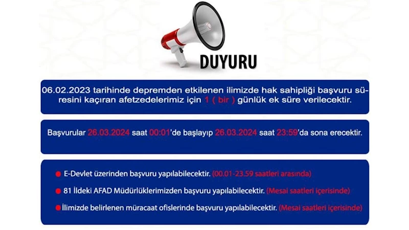 AFAD ve Adıyaman Valiliği tarafından yapılan duyuruda, başvuruların, 26 Mart 2024 tarihinde saat 00.01'de başlayacağı ve aynı gün saat 23.59'da sona ereceği bildirildi.