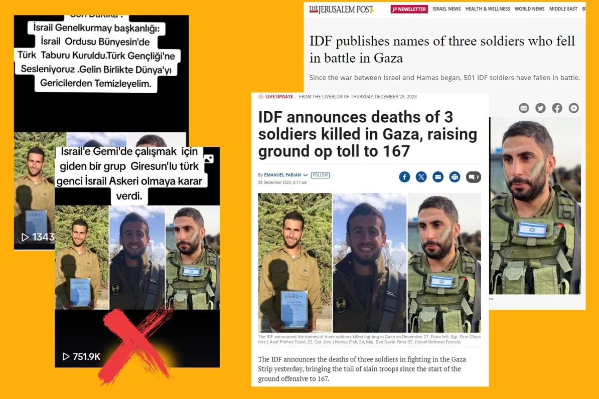 Bazı sosyal medya hesaplarında paylaşılan fotoğraflar ile ilgili “İsrail ordusuna katılan Türk askerleri gösterdiği” iddiası doğru olmadığı belirtilen açıklamada, "Fotoğrafta yer alan kişiler, Türk vatandaşı değildir.  Bahse konu fotoğrafta yer alan kişilerin, Aralık 2023'te Gazze Şeridi'nde ölen Asaf Pinhas Tubul, Neriya Zisk ve vir David Fima isimli İsrail askerleri olduğu tespit edilmiştir. Asılsız iddialara itibar etmeyiniz" ifadeleri yer aldı.