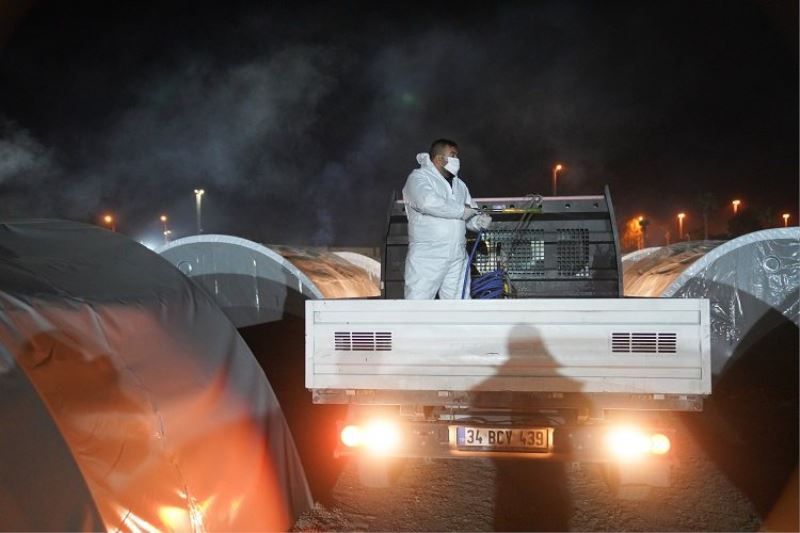 Beylikdüzü Belediyesi’nin Hatay İskenderun’da 70 dönümlük bir alanda kurduğu çadır kentte olası salgın hastalıklara karşı ilaçlama ve dezenfeksiyon çalışmaları başladı. Veteriner İşleri Müdürlüğü ekiplerince ortak kullanım alanları, tuvalet, duş ve çadırlar başta olmak üzere tüm alan ilaçlanarak dezenfekte ediliyor.