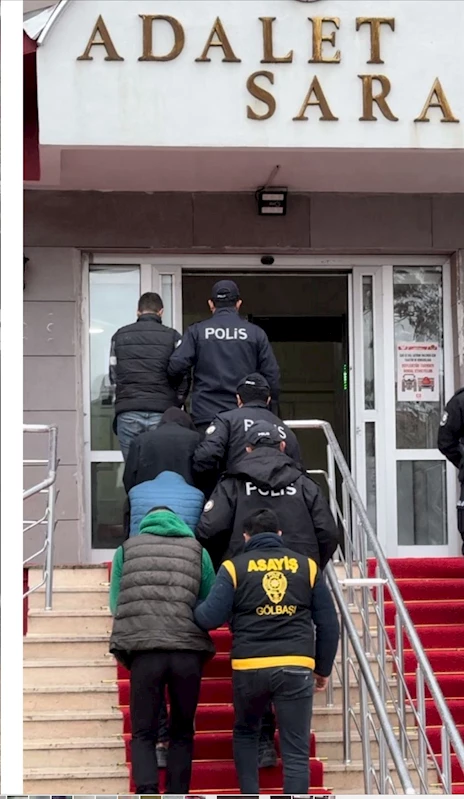 Gölbaşı İlçe Emniyet Müdürlüğü ekipleri tarafından Mimar Sinan Mahallesi'nde bir işyerinden hırsızlık yapıldığı bilgisi üzerine inceleme başlatıldı. Polis ekipleri çevrede bulunan güvenlik kamera görüntülerini incelemeye alarak görgü tanıkların ifadesine başvurdu. Polis ekiplerince yapılan incelemede şüphelilerin A.B., O.B. , H.B.B., İ.Ç.Y., olduğu belirlendi. Gözaltına alınan 4 şüpheli sorgulamasının ardından adliyeye sevk edildi. Adliyeye sevk edilen 4 şüpheli çıkartıldığı mahkemece tutuklandı. İşyerinden çalınan malzemeler ise sahiplerine teslim edildi.