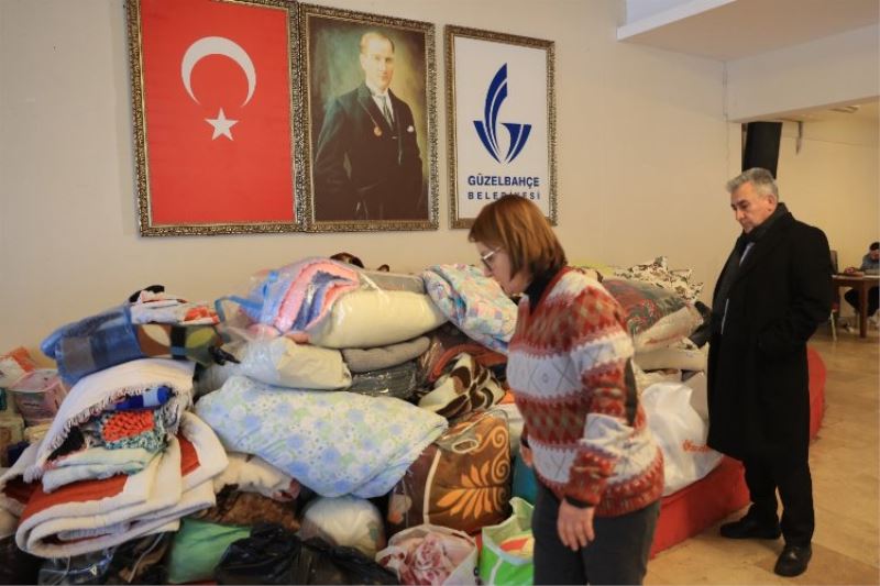 Güzelbahçe Belediyesi Düğün Salonundan belediye ve vatandaşlar tarafından tasnif edilerek kolilere konulan Battaniye, Isıtıcı, Çocuk Bezi, Yorgan, Kıyafet, Kadın pedi, ıslak mendil, ayakkabı. PowerBank, gibi malzemeler 5 kamyonetle İzmir Büyükşehir Belediyesi Lojistik Merkezi’ne götürüldü.