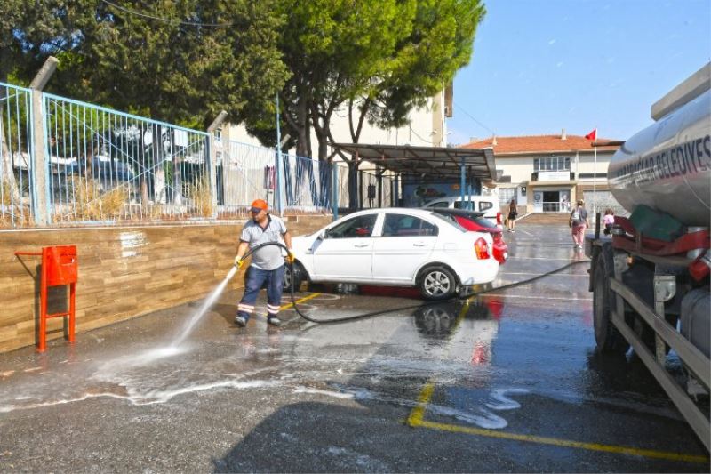 Bu kapsamda okul bahçeleri elle ve süpürge araçlarıyla süpürülüyor. Araçların manevra yapabileceği geniş okul bahçeleri ise tankerle yıkanıyor.