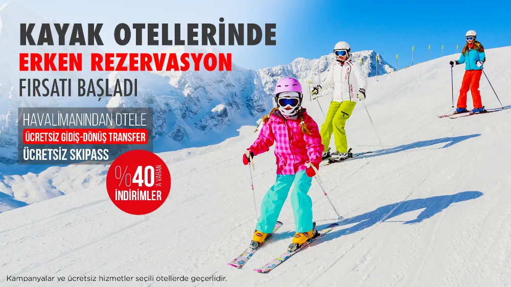 Kış mevsimi kapıda! Kar, eğlence ve macera dolu bir tatil mi istiyorsunuz? İşte size müjde: Kayak otellerinde başlayan Jolly Erken Rezervasyon Kampanyası ile %40'a varan indirimler, Ücretsiz Skipass ve ücretsiz havalimanından otele gidiş dönüş imkanı sizi bekliyor! Üstelik 16 ekime kadar geçerli kayak otellerinde 15.000 tl ve üzeri rezervasyonlarda ekstra 500 tl indirim fırsatı !