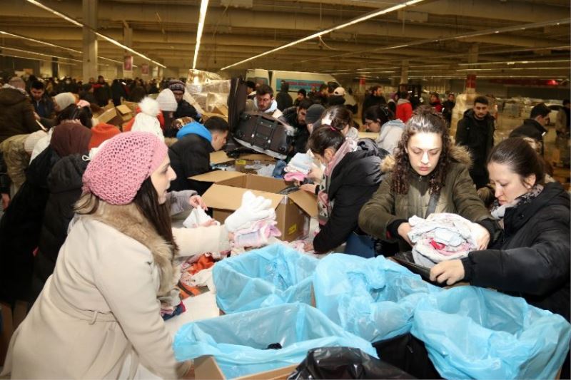 Deprem bölgesine gidecek olan ve Kocaeli genelinden gelen battaniye, ısıtıcı, soba, gıda, giyim ve hijyen maddeleri, eski Carrefour Alışveriş Merkezi’nde kurulan Ayni Yardım Kabul Merkezi’nde toplanıyor. Ayni Yardım Kabul Merkezine gelen yardım malzemeleri, ürün çeşidine göre ayrıştırılıp paketlenerek tırlara yüklenip, deprem bölgesine gönderiliyor. Ürünlerin ayrıştırılması, paketlenmesi ve tırlara yüklenmesinde, Büyükşehir personelleri, gönüllüler ve diğer vatandaşlar canla başla sabahlara kadar çalışıyor.
