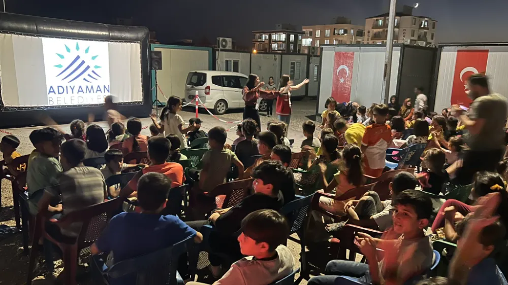 Kahramanmaraş merkezli 6 Şubat'ta meydana gelen depremlerden etkilenen çocukların, afetin psikolojik etkilerinden uzaklaşmalarını sağlamak amacıyla Adıyaman Belediyesi Basın Yayın ve Halkla İlişkiler Müdürlüğü tarafından haftada iki kere farklı bir konteyner kentte sinema etkinliği düzenleniyor.