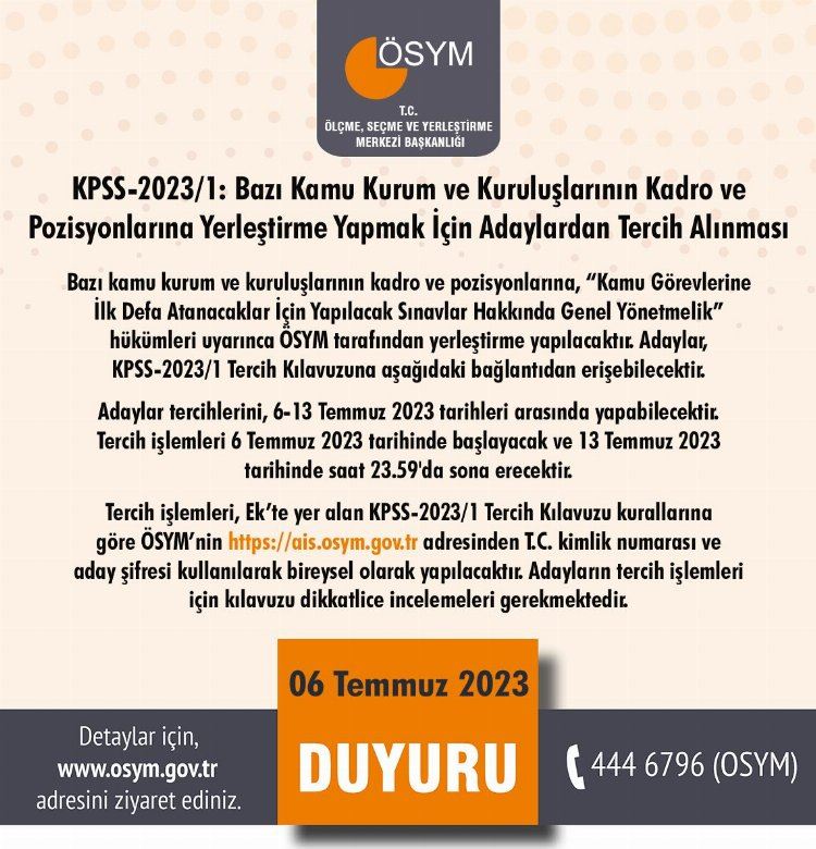 ÖSYM, bazı kamu kurum ve kuruluşlarının kadro ve pozisyonlarına yerleştirme yapmak için adaylardan tercih alınmasına yönelik KPSS-2023/1 Tercih Kılavuzu yayımladı.