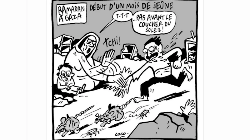 "Gazze'de Ramazan" başlıklı karikatürde, İsrail işgali altındaki Gazze'de savaşın ortasında Ramazan'ı idrak eden Filistinlilerin çektiği zorluklar alaycı ve duyarsız bir tarzda ele alındı. Corinne Rey imzalı karikatürde, acı çeken insanların ve dramatik bir durumun abartılı bir şekilde tasvir edilmesi okurlar ve sosyal medya kullanıcıları tarafından "küstahça" olarak nitelendirildi.