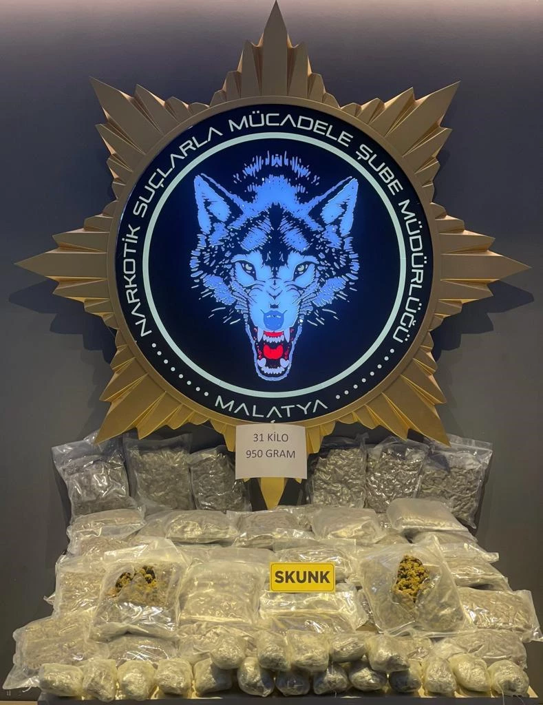 Malatya Cumhuriyet Başsavcılığı tarafından uyuşturucu satıcılarına yönelik yürütülen soruşturma kapsamında Malatya İl Emniyet Müdürlüğü'ne bağlı Narkotik Suçlarla Mücadele Şube Müdürlüğü ekipleri, uyuşturucu sevkiyatı yapılacağı bilgisi üzerine operasyon düzenledi. Kent merkezi girişinde oluşturulan uygulama noktasında durdurulan 2 araçta yapılan aramada, 2 valiz içerisinde 72 paket halinde 31 kilo 950 gram sentetik uyuşturucu, 1 ruhsatsız tabanca ve 11 mermi ele geçirildi. Uyuşturucular muhafaza altına alınırken gözaltına alınan 4 şüpheli sorgulanmak üzere emniyete götürüldü. Gözaltına alınan Ö.K, F.C, S.K. ve H.B., sorgulamaların ardından çıkartıldıkları mahkemece tutuklanarak cezaevine gönderildi.