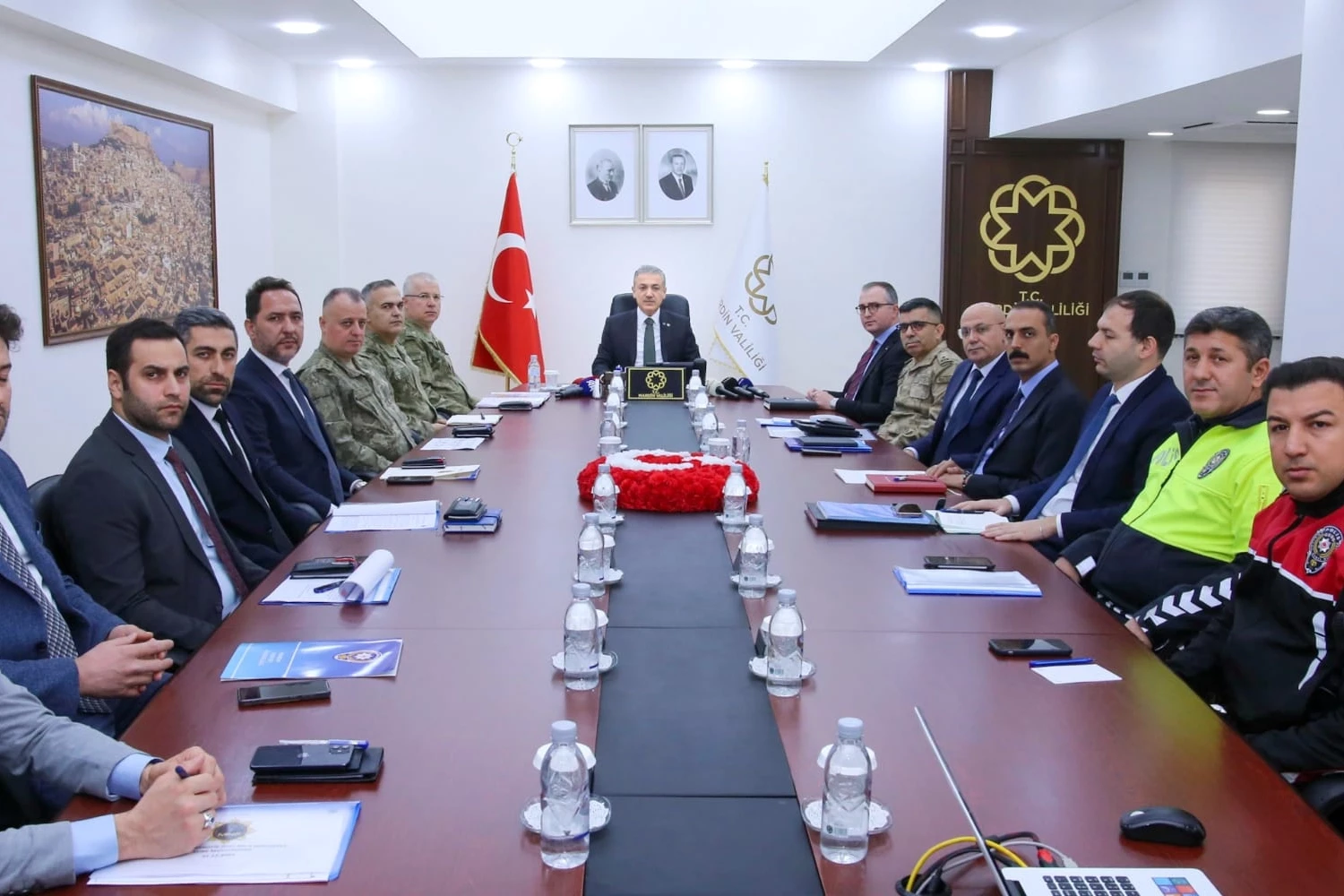 Mardin Valiliği Dara Toplantı Salonunda, Vali ve Büyükşehir Belediye Başkan Vekili Tuncay Akkoyun Başkanlığında, Vali Yardımcısı Mehmet Naim Akgül, İl Jandarma Komutanı Tuğgeneral Tahsin Saruhan, 70'inci Mekanize Piyade Tugay Komutanı Vekili Piyade Albay Cumhur Yazgan, İl Emniyet Müdürü Cebrail Buğday ve İlgili Kurum Amirlerinin katılımıyla yapılan toplantıda, "Yılbaşı Tedbirleri" değerlendirildi.