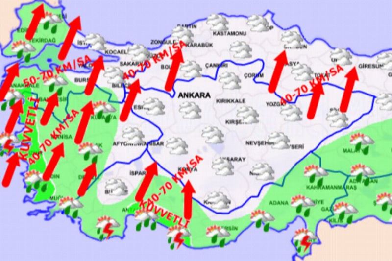 KUVVETLİ RÜZGÂR UYARISI: Rüzgârın; güneyli yönlerden Marmara, Ege, Göller Yöresi, İç Anadolu'nun batısı ile Karadeniz'in iç kesimlerinde kuvvetli olarak (40-70 km/saat) esmesi beklendiğinden yaşanabilecek olumsuzluklara karşı dikkatli ve tedbirli olunmalıdır.