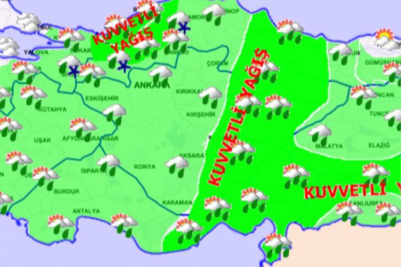 KUVVETLİ YAĞIŞ UYARISI: Doğu Akdeniz, İç Anadolu’nun doğusu, Batı Karadeniz’in batısı, Orta Karadeniz, Doğu Anadolu’nun güneyi, Güneydoğu Anadolu(Şanlıurfa hariç) ile Bursa, Bilecik, Yalova, Kocaeli, Sakarya ve Giresun çevrelerinde yerel olmak üzere kuvvetli, Düzce, Zonguldak, Bartın, Elazığ, Malatya’nın güneyi, Adıyaman, Diyarbakır’ın kuzey ve güneyi, Batman, Mardin, Şırnak, Hakkari ve Siirt çevrelerinde çok kuvvetli ve yer yer şiddetli olması beklendiğinden yaşanabilecek sel, su baskını, heyelan, ulaşımda aksamalar gibi olumsuzluklara karşı dikkatli ve tedbirli olunmalıdır.