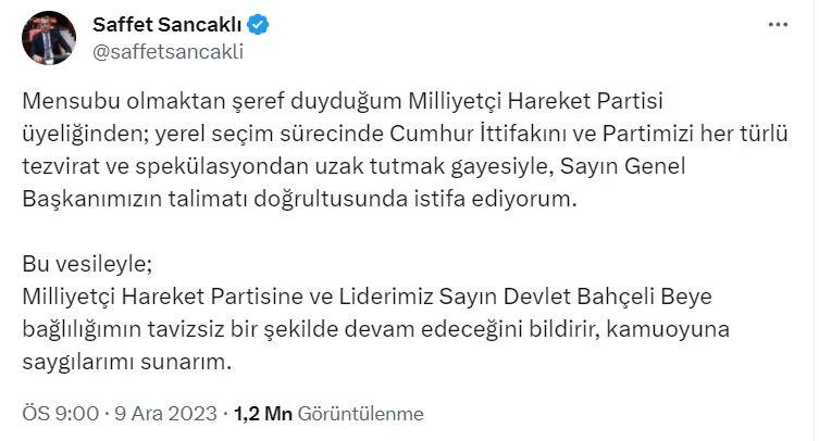 Saffet Sancaklı, sosyal medya hesabından yaptığı açıklamada, "Mensubu olmaktan şeref duyduğum Milliyetçi Hareket Partisi üyeliğinden; yerel seçim sürecinde Cumhur İttifakını ve Partimizi her türlü tezvirat ve spekülasyondan uzak tutmak gayesiyle, Sayın Genel Başkanımızın talimatı doğrultusunda istifa ediyorum. Bu vesileyle; Milliyetçi Hareket Partisine ve Liderimiz Sayın Devlet Bahçeli Beye bağlılığımın tavizsiz bir şekilde devam edeceğini bildirir, kamuoyuna saygılarımı sunarım" ifadelerini kullandı.