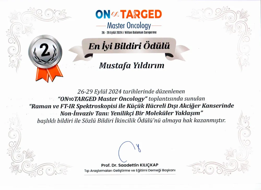 SANKO Üniversitesi Tıp Fakültesi İç Hastalıkları Ana Bilim Dalı Öğretim Üyesi, Tıbbi Onkolog Prof. Dr. Mustafa Yıldırım, On – Target Master Onkoloji Toplantısı’nda “Raman ve FT-IR Spektroskopisi ile Küçük Hücreli Dışı Akciğer Kanserinde Non – İnvaziv Tanı: Yenilikçi Bir Moleküler Yaklaşım” konusunda yaptığı sunumla “Sözel Bildiri İkincilik” ödülü aldı.